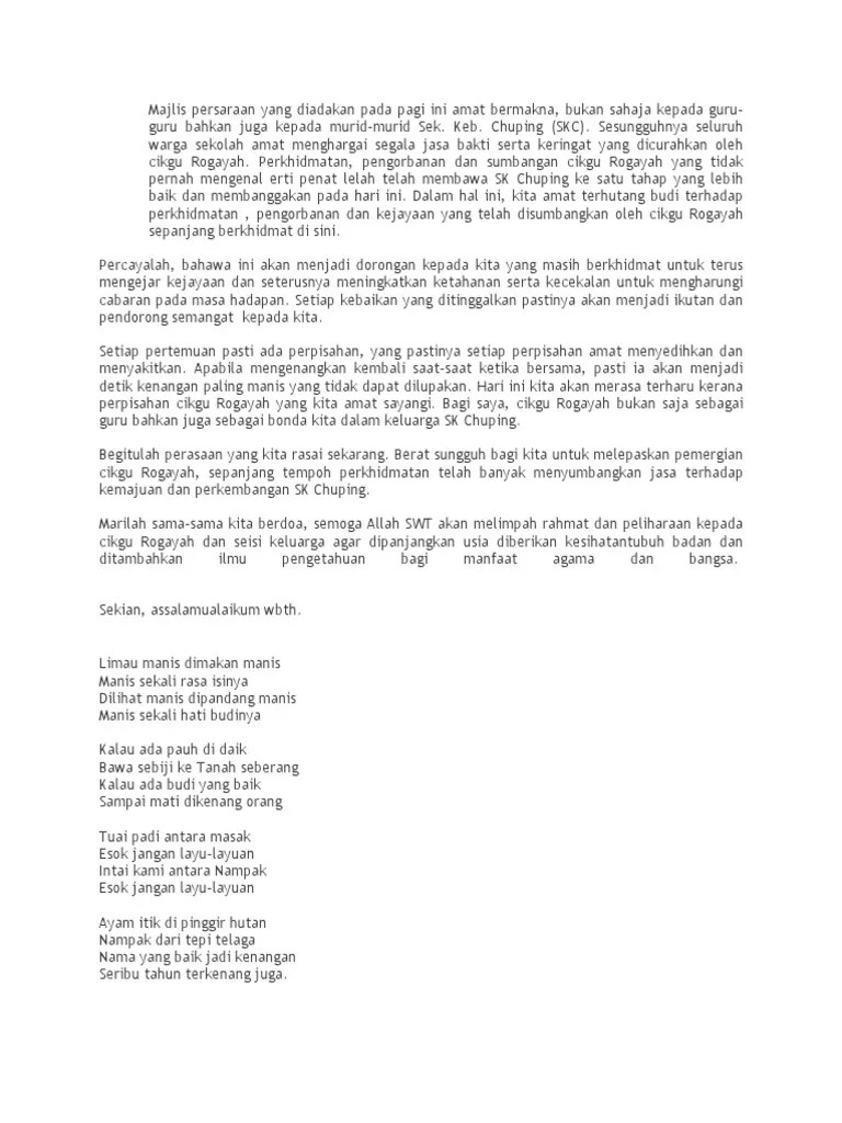 Majlis jambangan kasihjasamu dikenang baktimu. Mutiara kata persaraan guru cikimm com. Teks ucapan perpisahan guru bersara.